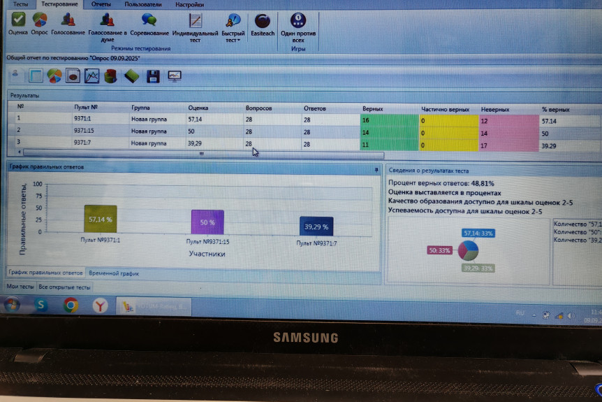 Процесс проходил следующим образом: каждому участнику выдавался пульт системы Votum, с помощью которого школьники выбирали правильный вариант ответа среди предложенных вариантов. Система автоматически обрабатывала полученные данные, выводила результаты на экран и позволяла моментально увидеть статистику правильных ответов.