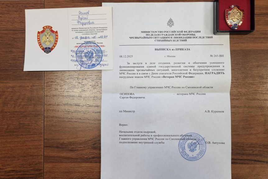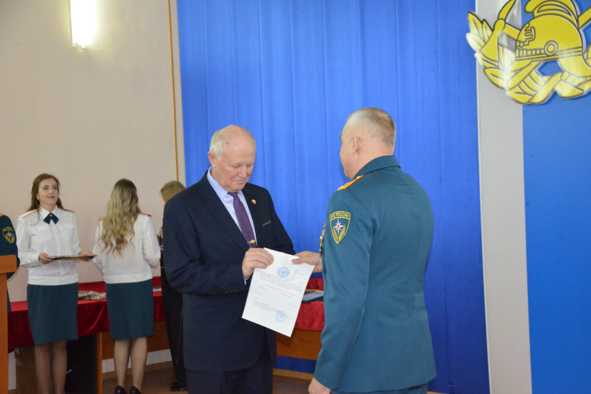 В продолжении собрания особые отличия вручал Первый заместитель начальника Главного управления МЧС России по Смоленской области Михаил Удалец. Председатель совета Смоленского областного ВДПО Сергей Осипов награжден нагрудным знаком МЧС России «Ветеран МЧС России»