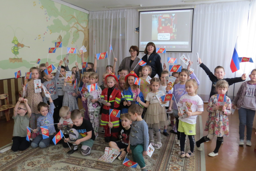Воспитанникам были вручены тематические буклеты с правилами пожарной безопасности и флажки от ВДПО.